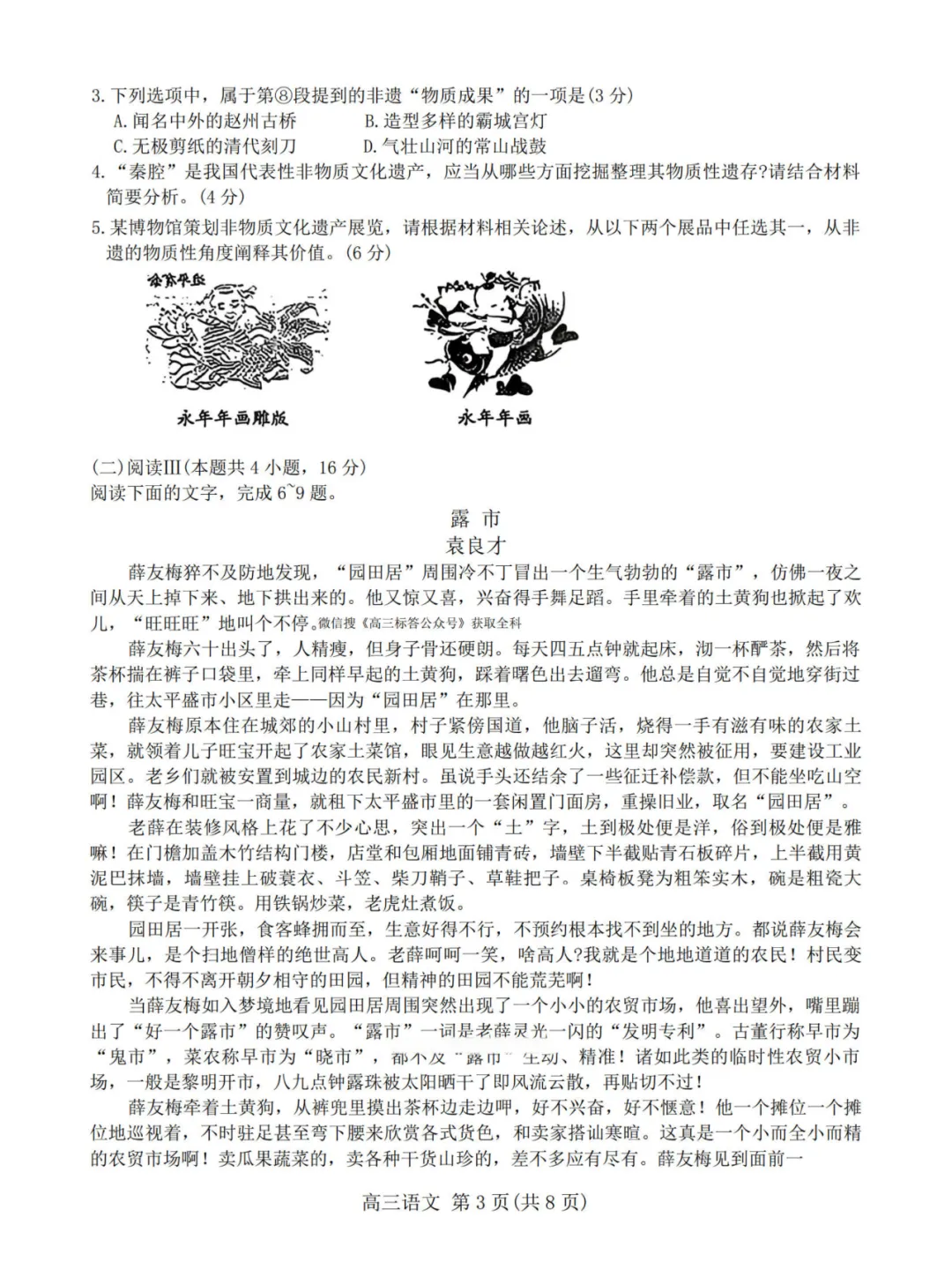 第5题选展品阐释,需从“物质成果”“历史见证”“工具实物”等角度区分雕版与年画的不同价值,对逻辑严密性要求高。