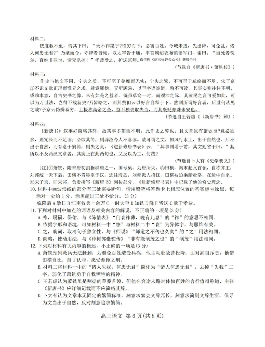 材料:《旧唐书》《新唐书》萧铣传 + 王若虚、卜大有的史学批评