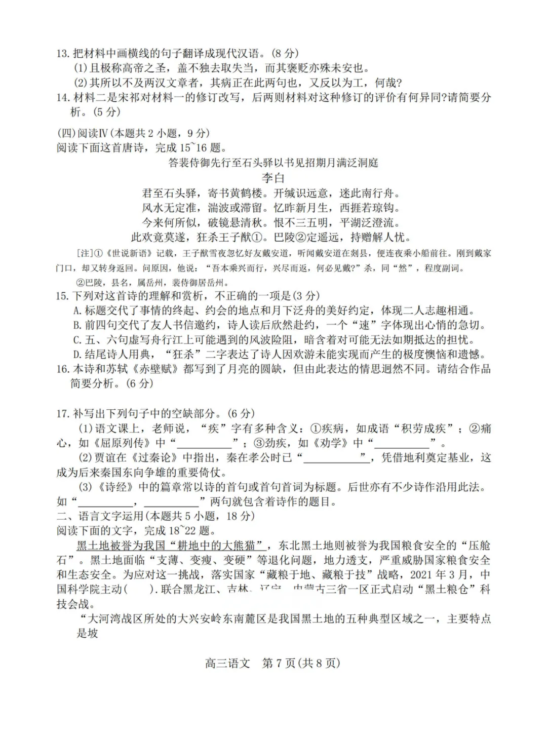 第16题需结合李白此诗的“遗憾”与苏轼的“旷达”对比,不能只写单篇。
