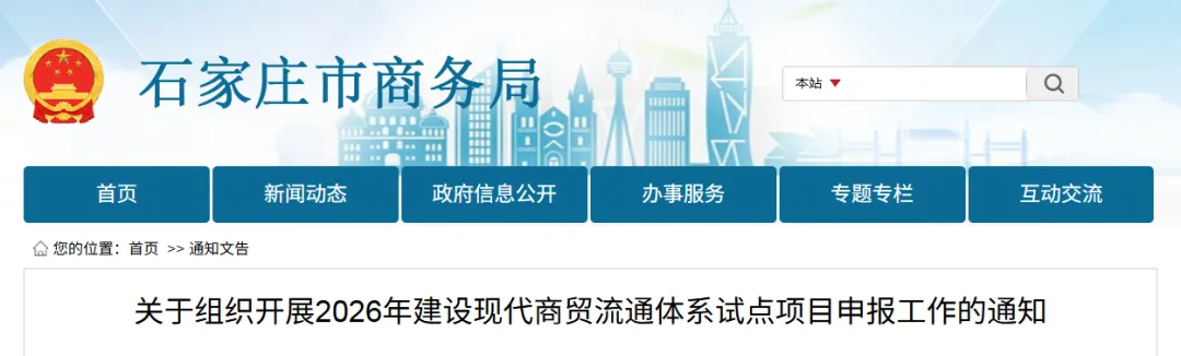 为推动我市现代商贸流通体系试点城市建设工作,根据《石家庄市建设现代商贸流通体系试点城市项目管理办法》(石商〔2024〕238号)等有关规定,现启动我市2026年度现代商贸流通体系试点项目申报工作,具体要求如下。