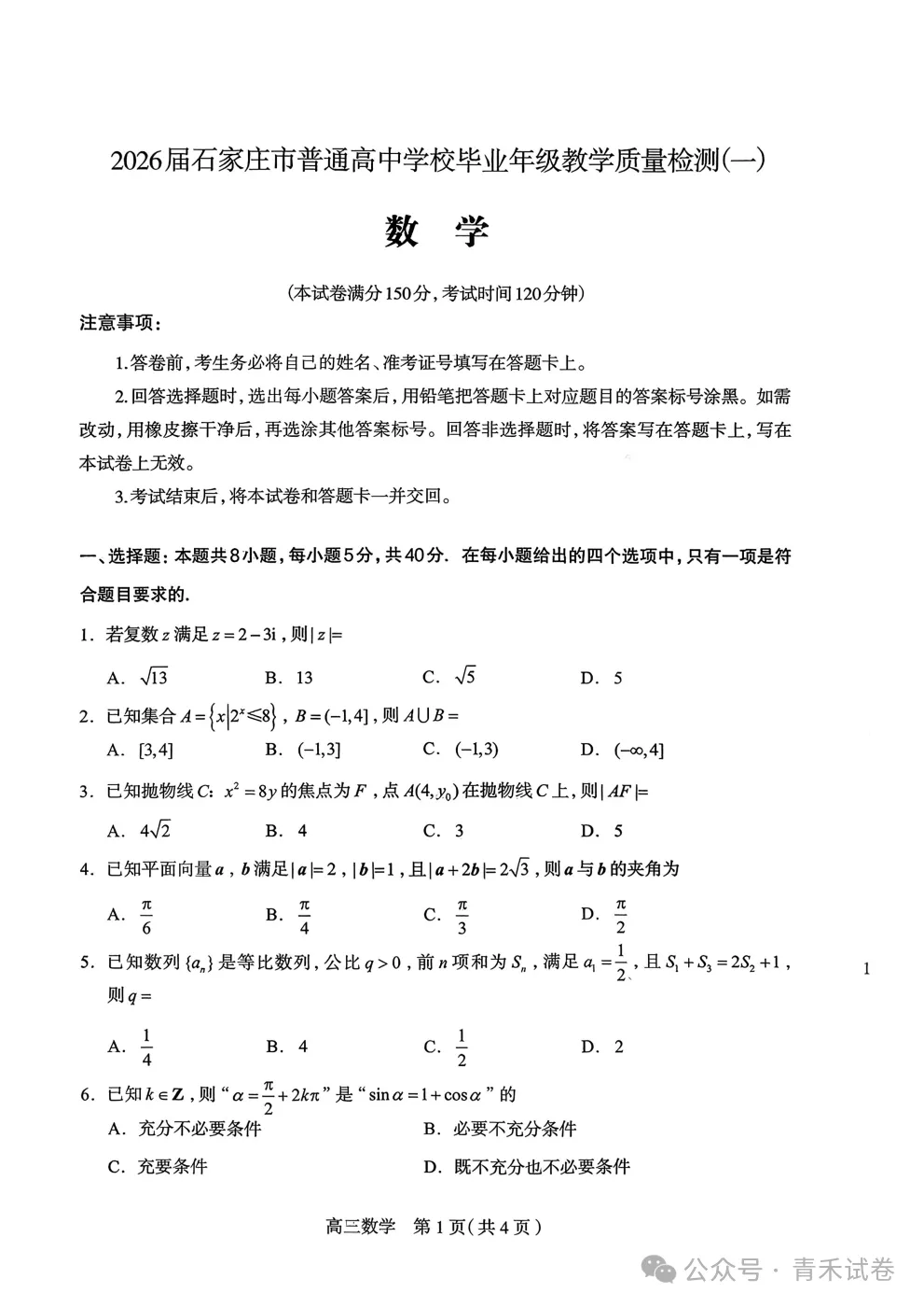石家庄一模|石家庄市 2026 届普通高中毕业年级教学质量检测(一)数学试题及答案