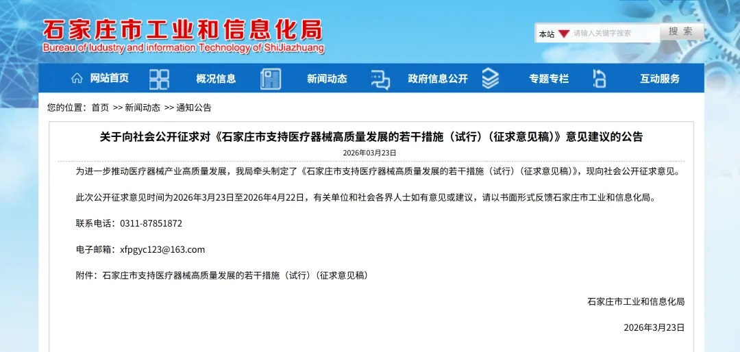 为进一步推动医疗器械产业高质量发展,我局牵头制定了《石家庄市支持医疗器械高质量发展的若干措施(试行)(征求意见稿)》,现向社会公开征求意见。