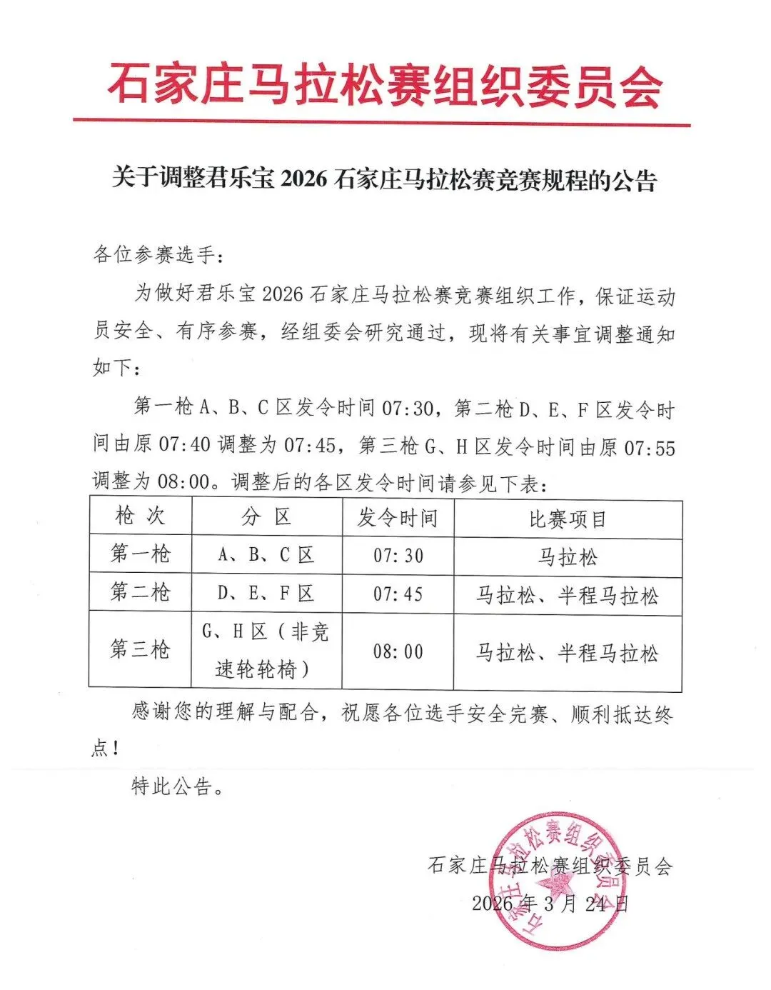 关于调整2026石家庄马拉松赛竞赛规程的公告(调整发令时间)