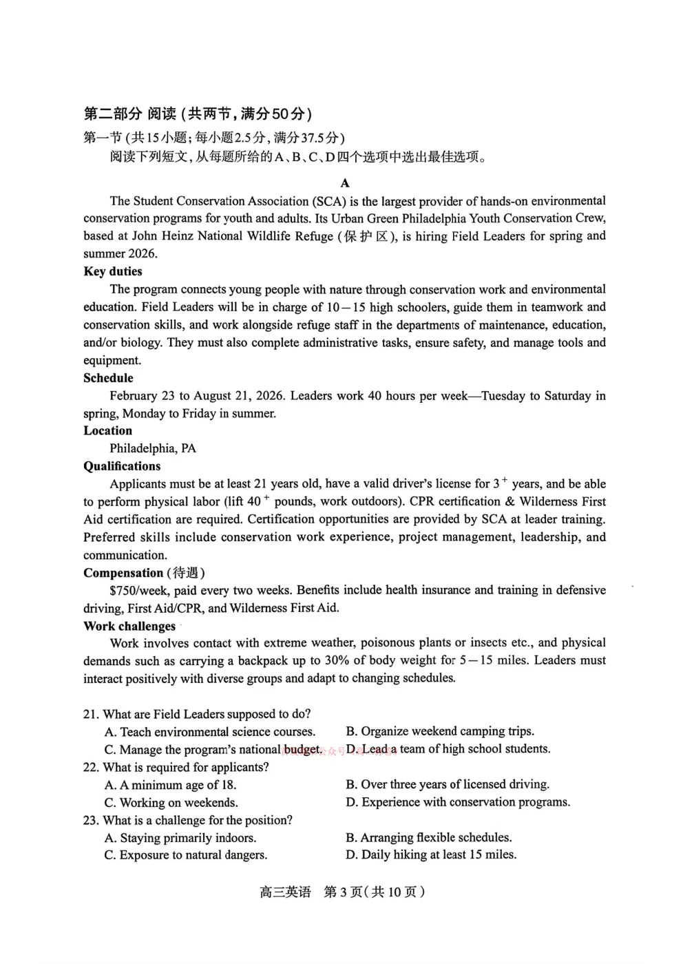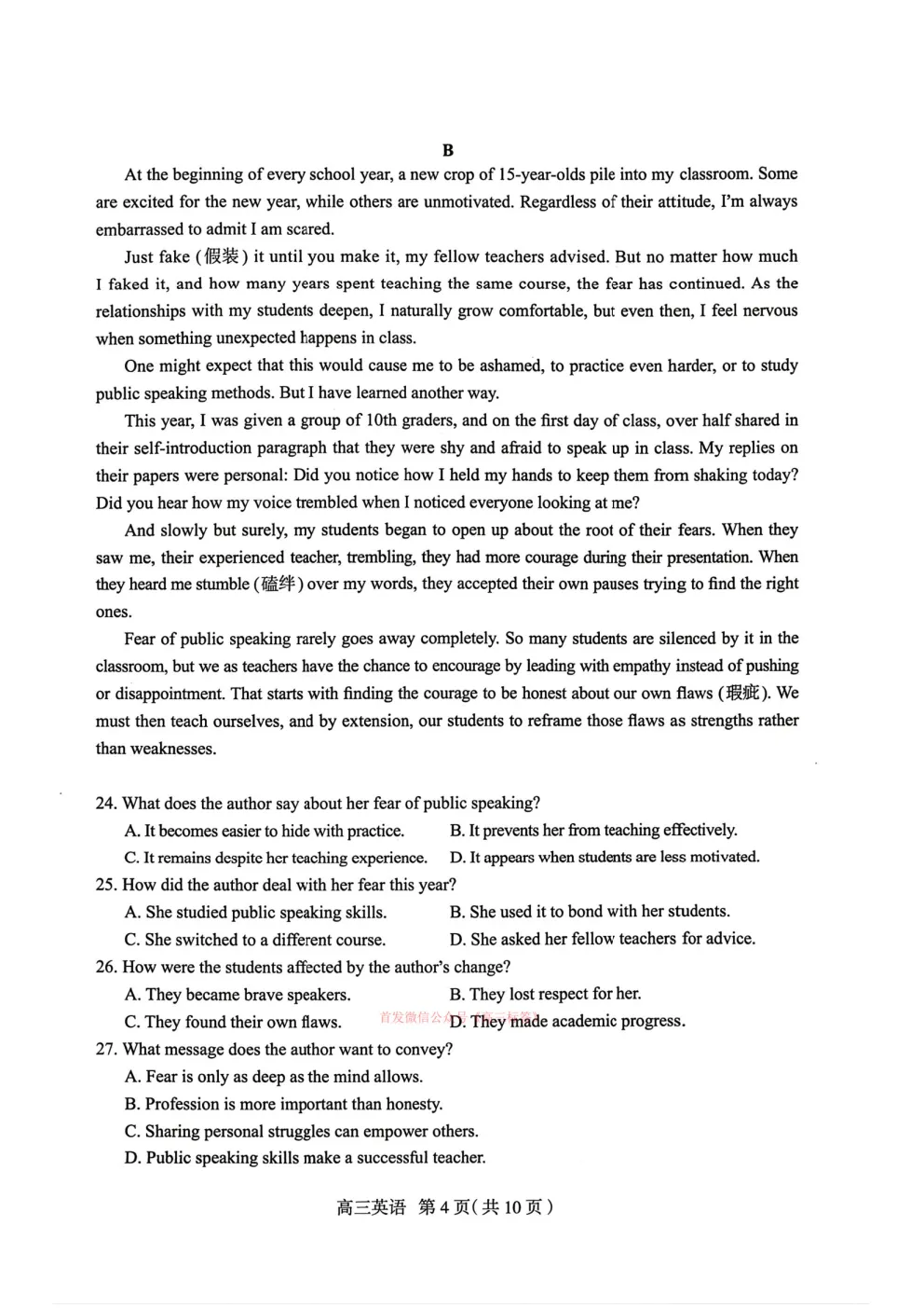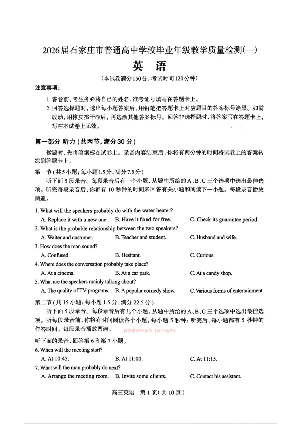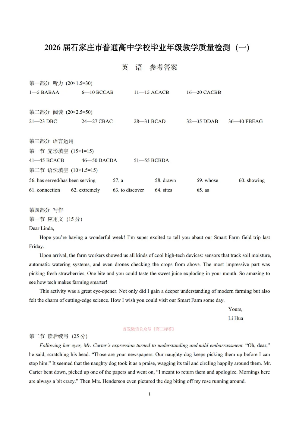 >2026石家庄一模英语答案