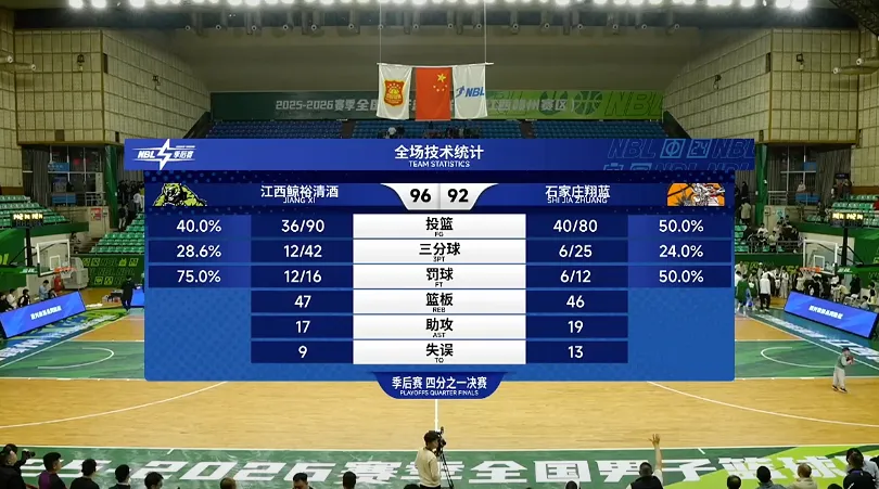 北京时间3月24日,NBL季后赛首轮首场比赛,石家庄翔蓝客场对阵江西鲸裕清酒。半场比赛战罢,石家庄翔蓝反客为主54-40领先。易边再战,石家庄翔蓝进攻端断电,迟迟未能得分,最终四节比赛战罢,石家庄翔蓝客场92-96惨遭逆转,大比分0-1落后。