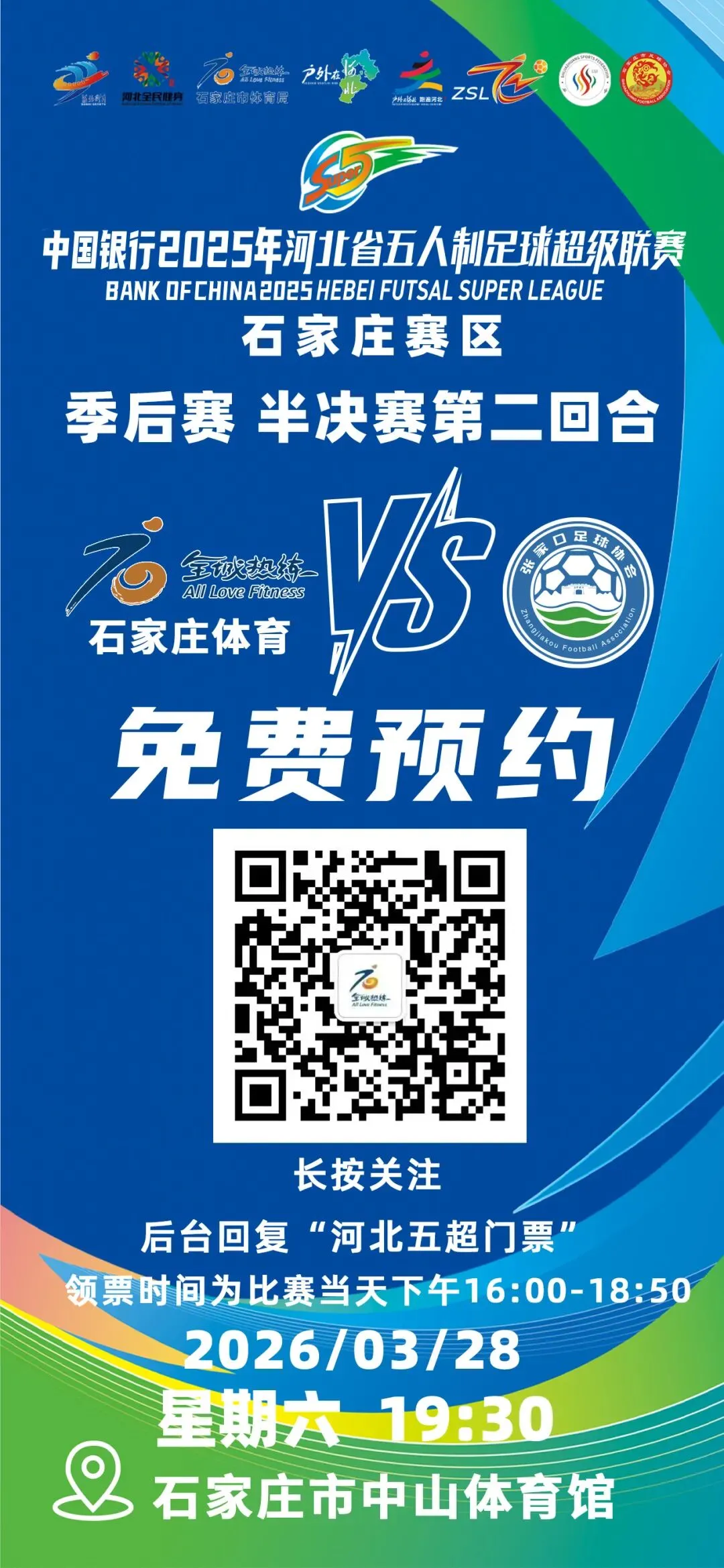 3月28日19:30,中国银行2025年河北省五人制足球超级联赛季后赛半决赛第二回合,石家庄队坐镇中山体育馆主场,迎战张家口队!首回合激战过后,晋级决赛的终极悬念即将揭晓,诚邀全城球迷亲临现场,为石家庄队呐喊助威,见证燕赵足球巅峰对决!