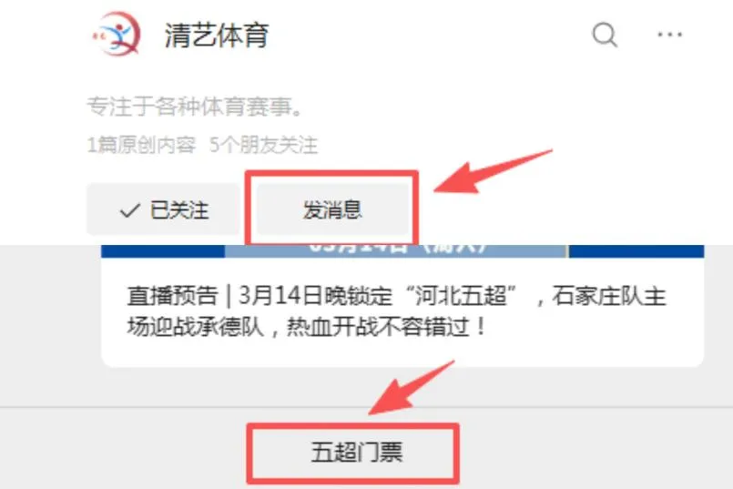 2.关注「清艺体育」微信公众号,点击【发消息】后点击下方【五超门票】专栏预约。
