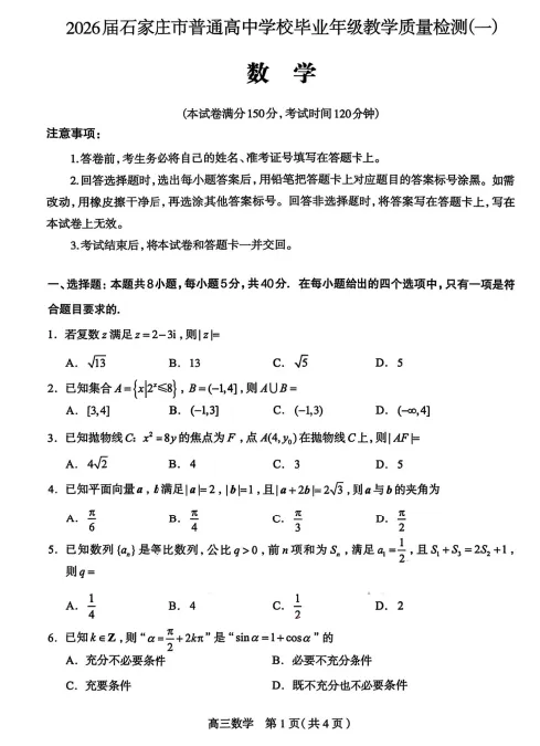 2026年石家庄市普通高中毕业年级教学质量检测(一)石家庄一模数学试卷
