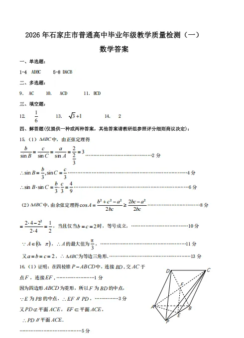 【石家庄一模】石家庄市 2026 届普通高中毕业年级教学质量检测(一)(一模)数学试卷及答案
