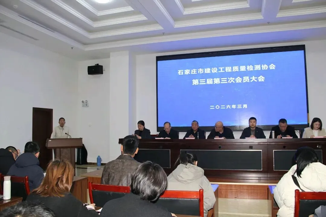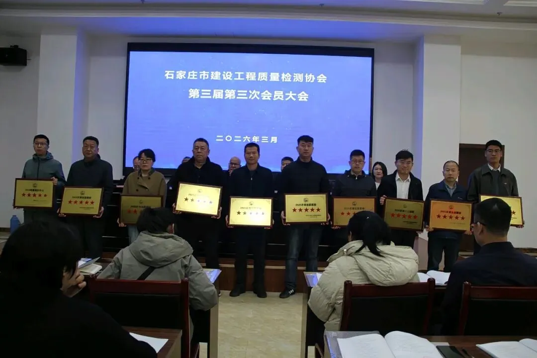 2026 年 3 月 24 日,石家庄市建设工程质量检测协会第三届第三次会员大会在河北道桥工程检测有限公司顺利召开。石家庄市住房和城乡建设局工程质量负责人刘冬同志到会指导,协会全体会员单位代表参加会议。会议全面总结 2025 年度工作,部署 2026 年重点任务,完成章程修改、信誉等级单位授牌、理事单位增补及协会负责人选举等议程,为全市建设工程质量检测行业高质量发展凝聚共识、明晰方向。 会长王彦平作2025 年度工作总结及 2026 年度工作计划报告,系统回顾协会在行业自律、技术服务、诚信建设、桥梁纽带等方面的工作成效,明确新一年围绕规范发展、能力提升、服务升级的重点任务。副会长赵坤影作2025 年度财务工作报告,全面汇报财务收支情况,确保公开透明。副会长李云泽宣读协会章程修改说明,全体会员审议并表决通过修订草案。 会上举行了2025 年度五星信誉等级单位授牌仪式,34 家单位获此荣誉。河北智诚检验认证集团有限公司副总经理高春雷作为信誉单位代表发言,承诺严守协会章程、坚守诚信底线、积极参与行业建设,以真实可靠检测数据守护工程质量。