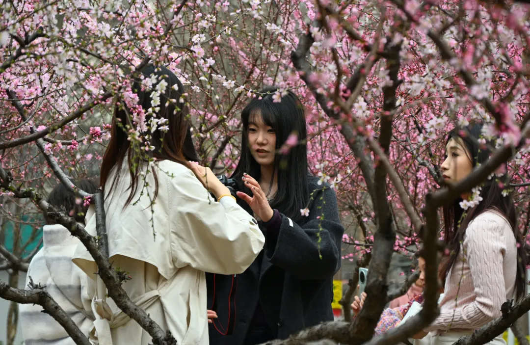 长安公园的阳光草坪上,市民或三五成群在树下拍照打卡,或席地而坐悠闲享受午后暖阳;孩子们的笑声在湖畔步道上随风飞扬,与摇曳的花枝相和。裕西公园桃花岛北入口处,临水的杏花亭亭玉立,粉白花瓣轻拂水面,花影与波光潋滟交叠,吸引了大量摄影爱好者与踏青市民驻足。