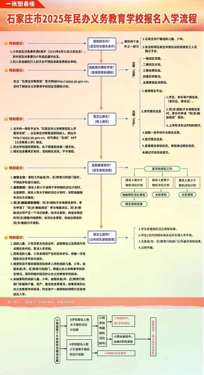 全市民办小学、初中招生工作:符合报名条件且有意报名民办义务教育学校的适龄儿童、少年,家长可通过“石家庄市义务教育招生入学服务系统”进行报名。全市有直升计划的民办初中学校7月14日直升计划报名,7月15日直升、单列计划进行录取,7月16日直升、单列计划录取学生报到;全市有随机派位计划的民办小学报名安排在7月17日—7月18日。全市有随机派位计划的民办初中报名安排在7月20日—7月21日。全市民办小学、初中电脑随机派位工作安排在7月23日进行。民办小学、初中电脑随机派位录取学生于7月24日—7月25日报到。(民办义务教育学校招生计划于民办义务教育学校招生工作开始前另行通知)