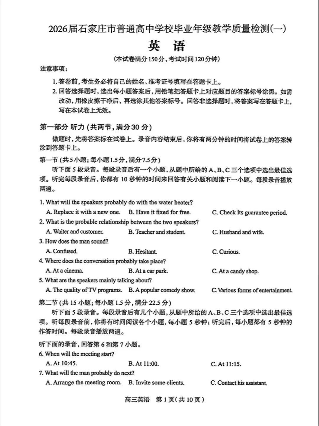 >特别像高考题!2026届石家庄一模