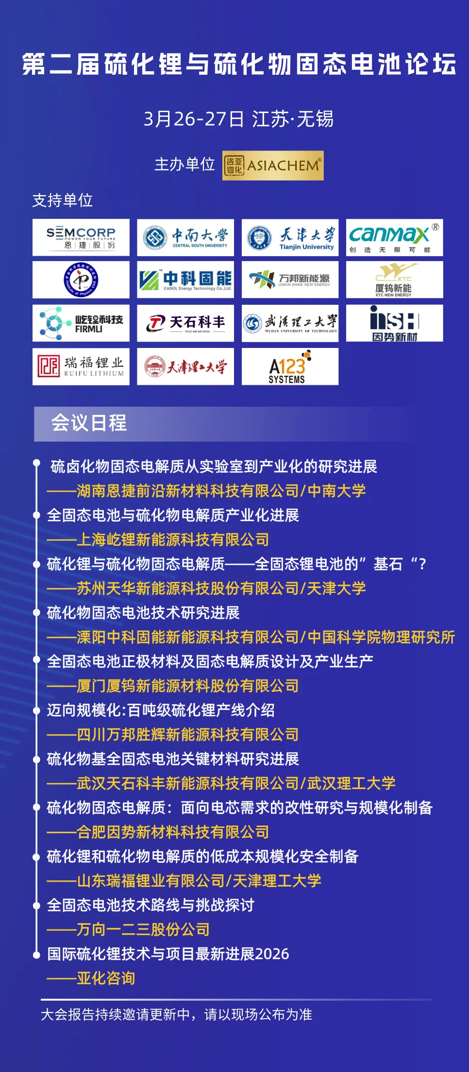 第二届硫化锂与硫化物固态电池论坛将于3月26-27日在无锡召开
