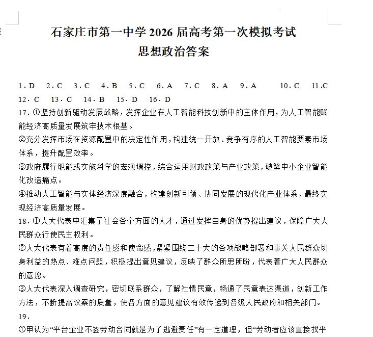 河北省石家庄市2026届高三一模考试政治试卷(含答案)