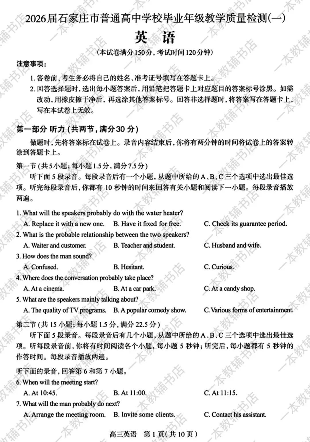 【沈阳一模】辽宁省2026年沈阳市高三年级教学质量监测(一)‖全科(含听力音频)