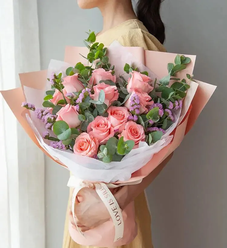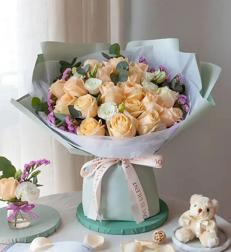钟意你-19朵香槟玫瑰粉色勿忘我白色桔梗搭配尤加利,只要你开心,比什么都好。除了11枝红玫瑰,还有19枝香槟玫瑰和19枝红玫瑰可以选择,总有一款适合你!