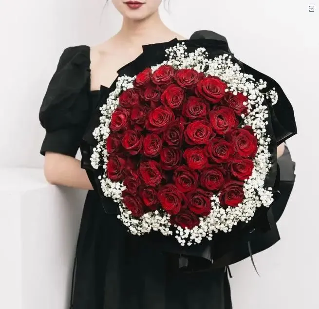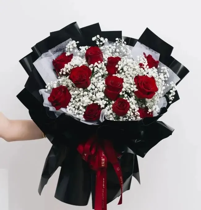 精选11枝红玫瑰,寓意一生一世的爱。浓郁热烈的红玫瑰,搭配纯洁干净的白色满天星,繁星点点就像拥抱整个星辰。