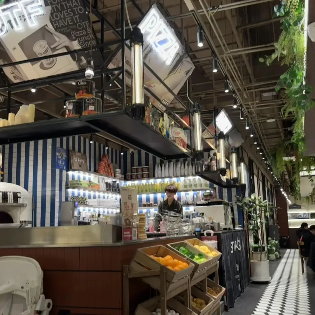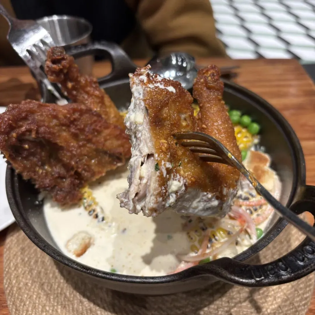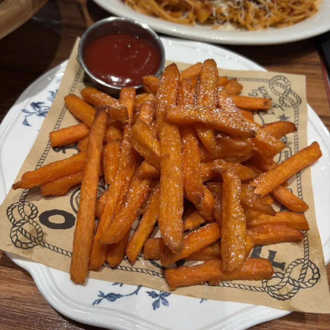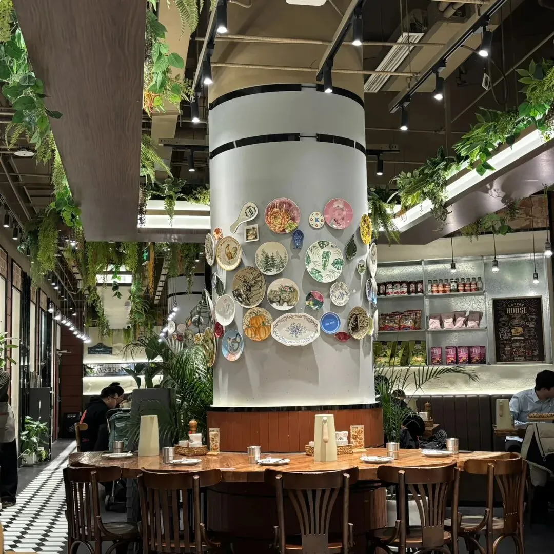 我们是晚上去的,当时店里坐了两三桌人。整体店面装修非常有格调,木质桌椅搭配绿植,美式风格很温馨。他家菜品种类很多。有披萨汉堡沙拉意面,还有一些特色菜,可以看出价格都不低。我们点的是他家平台上的团购双人餐。下面是套餐内容。我们选的是黑松露披萨、法式铁锅奶油鸡、肉酱面,以及传统红薯条。这是黑松露披萨。我一开始怕这个套餐不够吃,披萨一上就知道稳了。披萨很大一张。披萨口感很扎实,香肠肉感很足,我个人喜欢吃卷边的部分。整个披萨我俩一人吃了两块,剩下的半张打包带走了。汤底的奶油不腻,一股淡香。鸡块应该是炸过的,吃第一口很香,肉质很滑嫩,但是再吃就感觉很油腻。我这一块鸡都没能吃完。倒是里面的玉米不错,陪着奶油吃风味独特。这份四块玉米,我全吃了。这个意面我感觉一般,和其他店里的都差不多。不难吃,也说不上太有记忆点。最后上的是炸红薯条。红薯条配番茄酱,我感觉有些奇怪。单吃倒是不错。另外他家有打卡免费送的活动,可以送毛绒挂件、饮品、茶包,三选一。我本来想要毛绒挂件,结果服务员给我拿来一个筐让我挑,我一看,实在都太丑了。他家的服务我感觉很好,不收取任何打包费,而且打包的时候,还特意给拿了一盒新的番茄酱。服务员也会在临走前询问用餐体验。说实话不便宜,但个人感觉,无论是菜品、环境,还是服务,我都是愿意再去的。