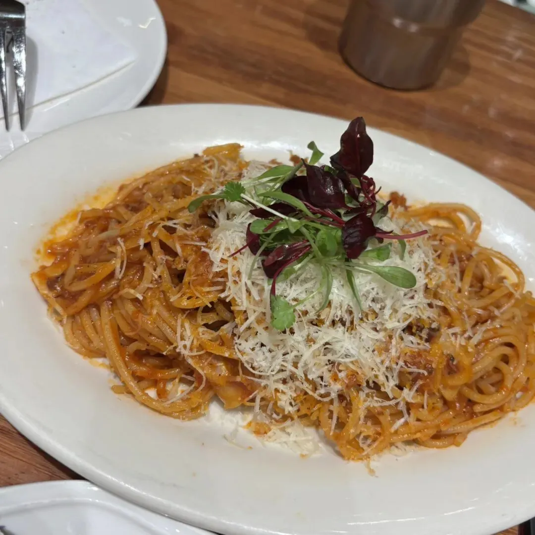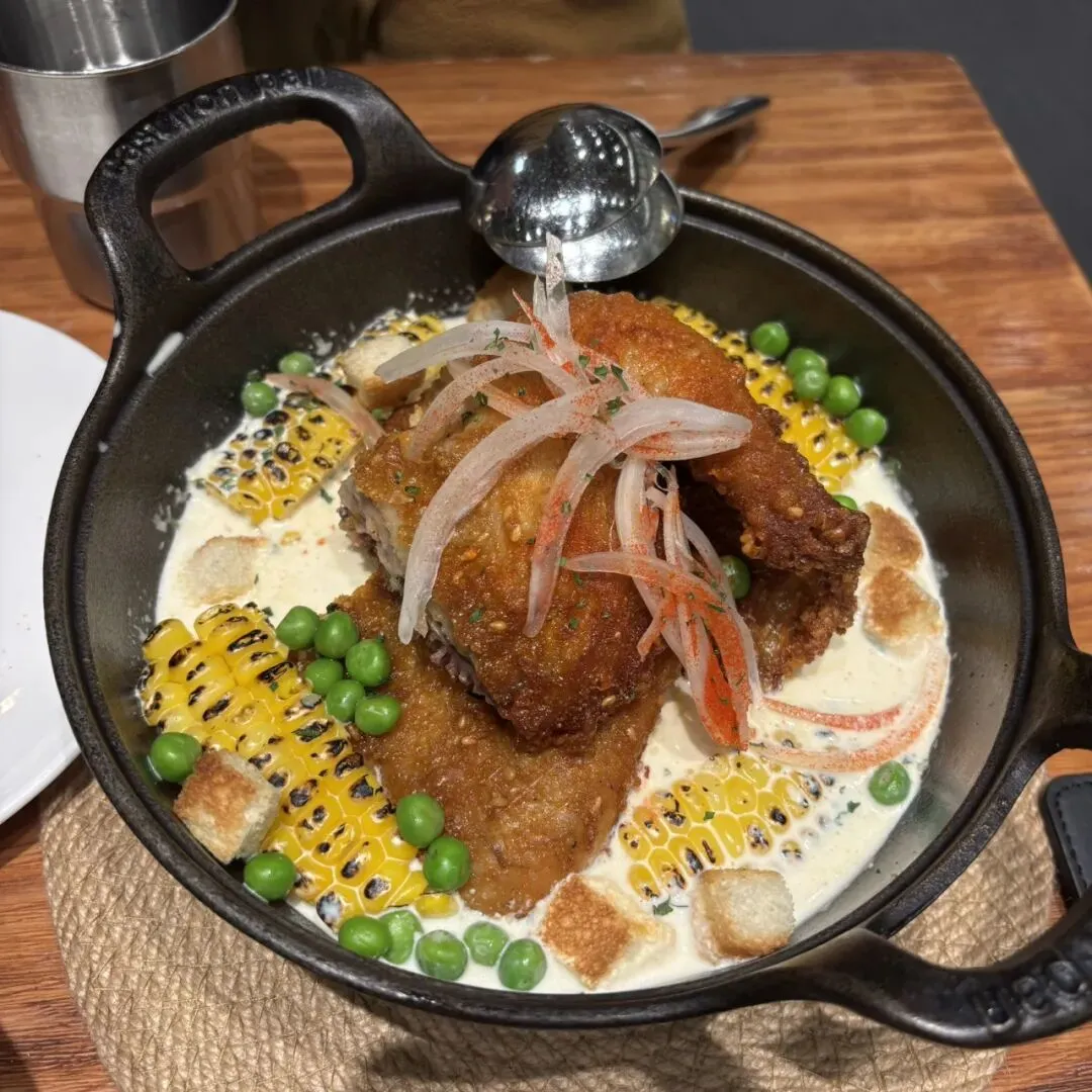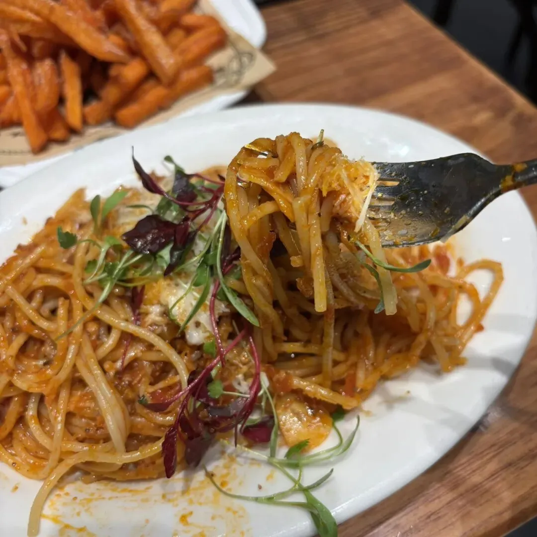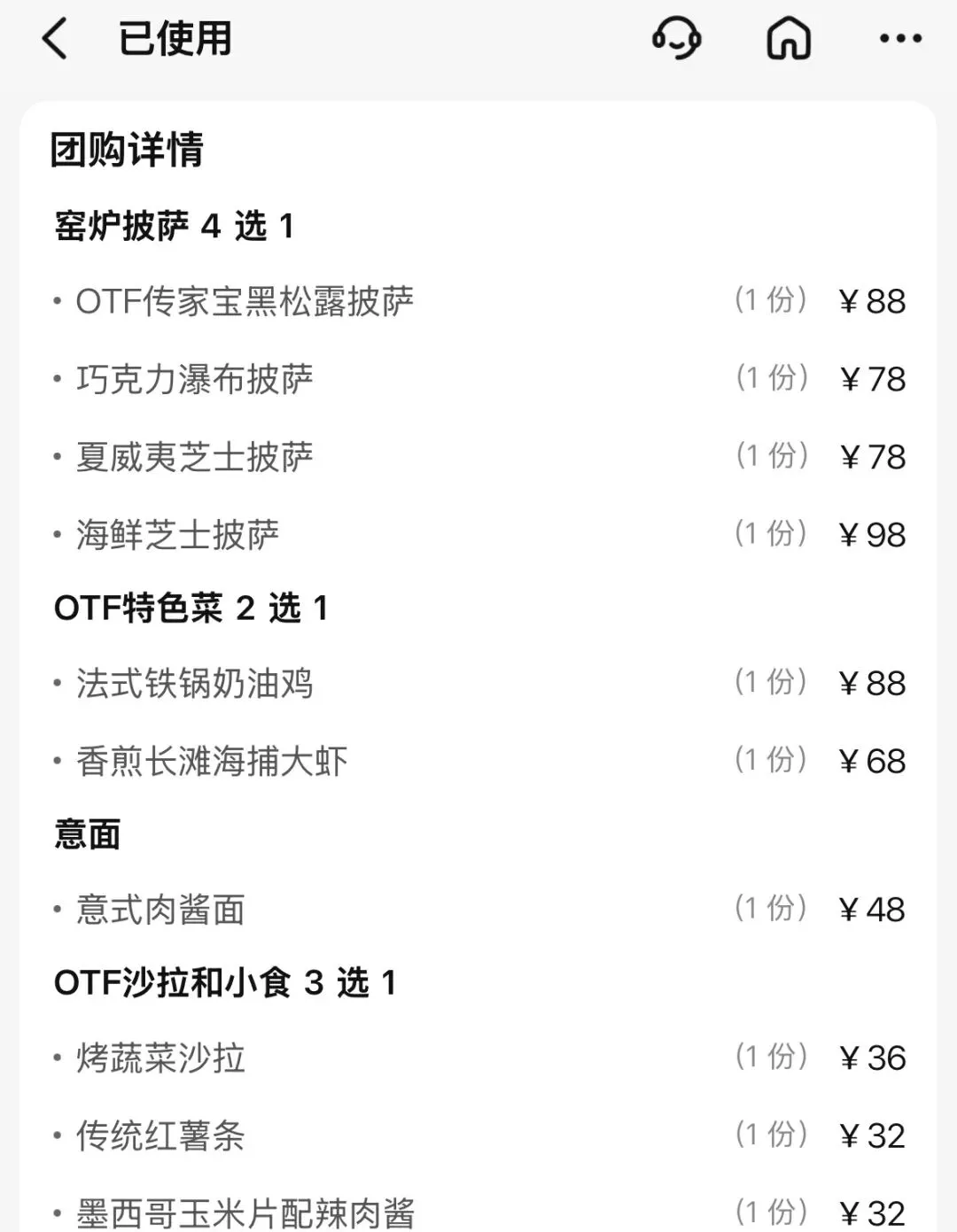 我们是晚上去的,当时店里坐了两三桌人。整体店面装修非常有格调,木质桌椅搭配绿植,美式风格很温馨。他家菜品种类很多。有披萨汉堡沙拉意面,还有一些特色菜,可以看出价格都不低。我们点的是他家平台上的团购双人餐。下面是套餐内容。我们选的是黑松露披萨、法式铁锅奶油鸡、肉酱面,以及传统红薯条。这是黑松露披萨。我一开始怕这个套餐不够吃,披萨一上就知道稳了。披萨很大一张。披萨口感很扎实,香肠肉感很足,我个人喜欢吃卷边的部分。整个披萨我俩一人吃了两块,剩下的半张打包带走了。汤底的奶油不腻,一股淡香。鸡块应该是炸过的,吃第一口很香,肉质很滑嫩,但是再吃就感觉很油腻。我这一块鸡都没能吃完。倒是里面的玉米不错,陪着奶油吃风味独特。这份四块玉米,我全吃了。这个意面我感觉一般,和其他店里的都差不多。不难吃,也说不上太有记忆点。最后上的是炸红薯条。红薯条配番茄酱,我感觉有些奇怪。单吃倒是不错。另外他家有打卡免费送的活动,可以送毛绒挂件、饮品、茶包,三选一。我本来想要毛绒挂件,结果服务员给我拿来一个筐让我挑,我一看,实在都太丑了。他家的服务我感觉很好,不收取任何打包费,而且打包的时候,还特意给拿了一盒新的番茄酱。服务员也会在临走前询问用餐体验。说实话不便宜,但个人感觉,无论是菜品、环境,还是服务,我都是愿意再去的。