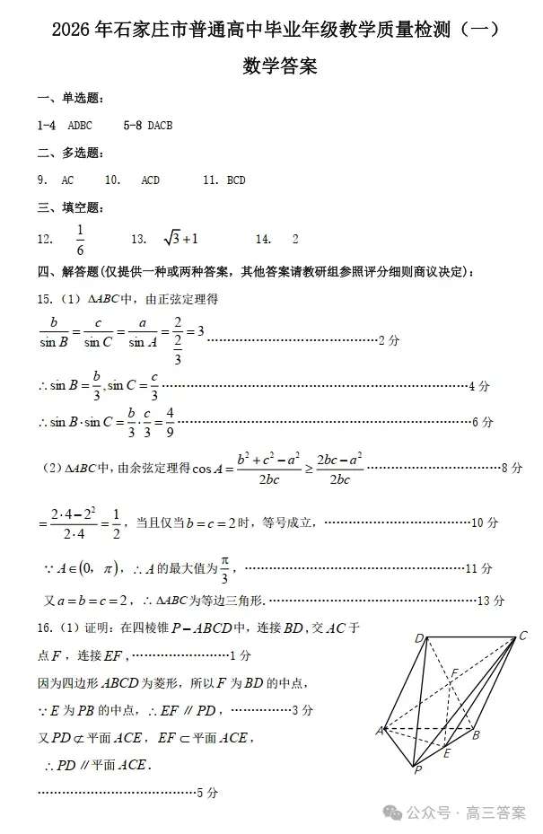 【高三】河北省2026届石家庄市普通高中学校毕业年级教学质量检测(一)(一模)(全)
