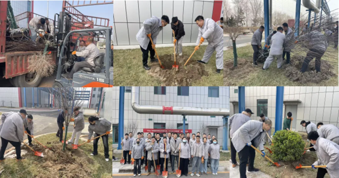 活动现场,员工们挥锹铲土、培土围堰、提水浇灌,精神饱满、分工协作,种下一株株苗木。在和煦春风吹拂下,新植的紫叶李、金叶榆、高杆卫矛球等树木迎风挺立、生机勃勃。