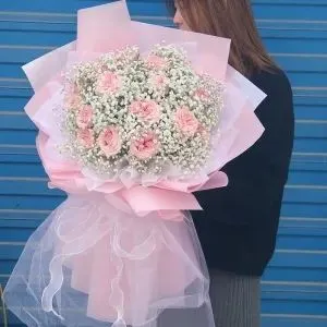 红色康乃馨13枝,粉佳人玫瑰5枝、3头或以上粉色洋桔梗5枝、粉色紫罗兰3枝(紫罗兰花期为12-4月,其他月份用粉色金鱼草/粉色桔梗等相似线状花材替代)、红豆5枝,尤加利10枝