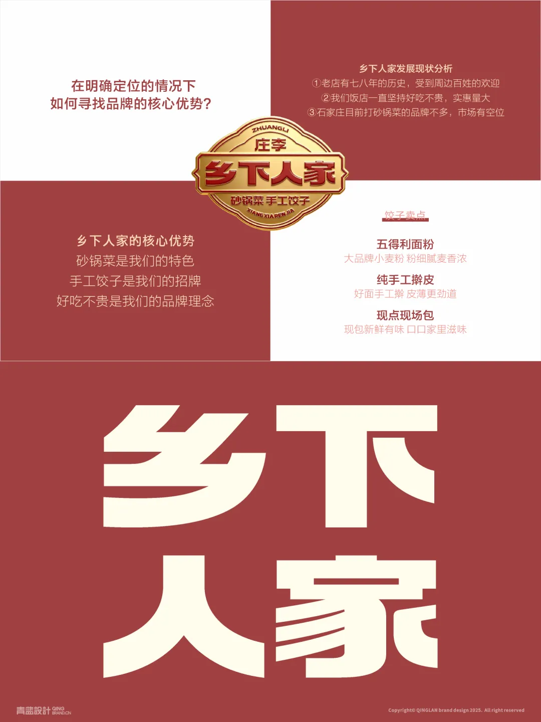🥊品牌塑造目标: 进行老店升级,深入挖掘民族历史文化底蕴,统一品牌形象,讲好品牌故事,重塑消费者对乡下人家的认知,从而增加老顾客的信任感,吸引更多新客。