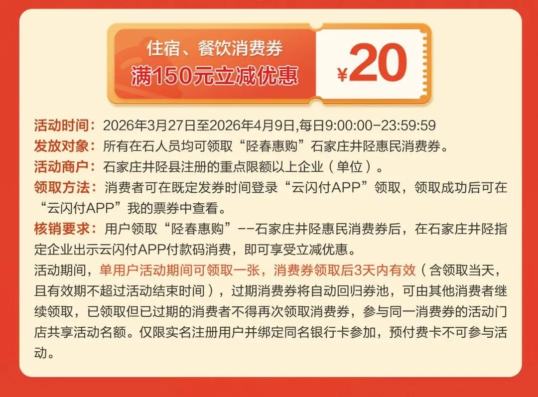 用户领取“陉春惠购”--石家庄井陉惠民消费券后,在石家庄井陉指定企业出示云闪付APP付款码消费,即可享受立减优惠。