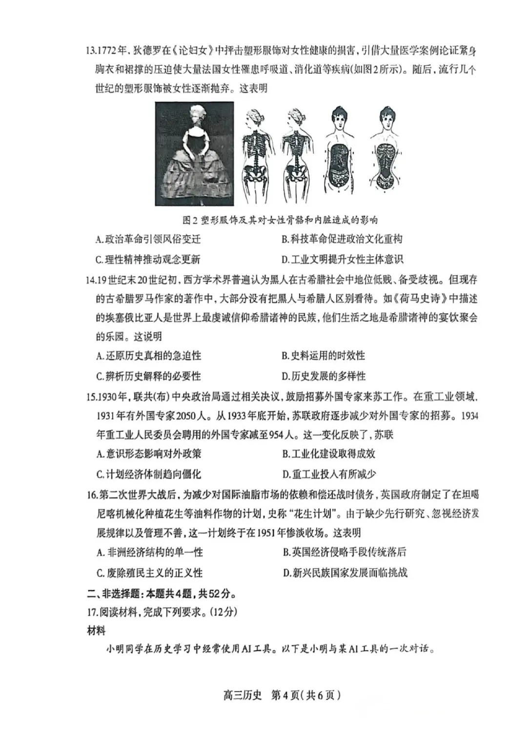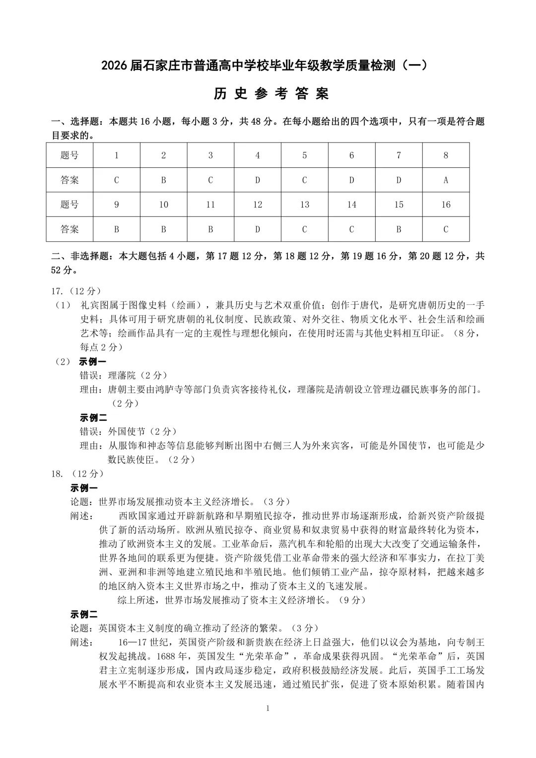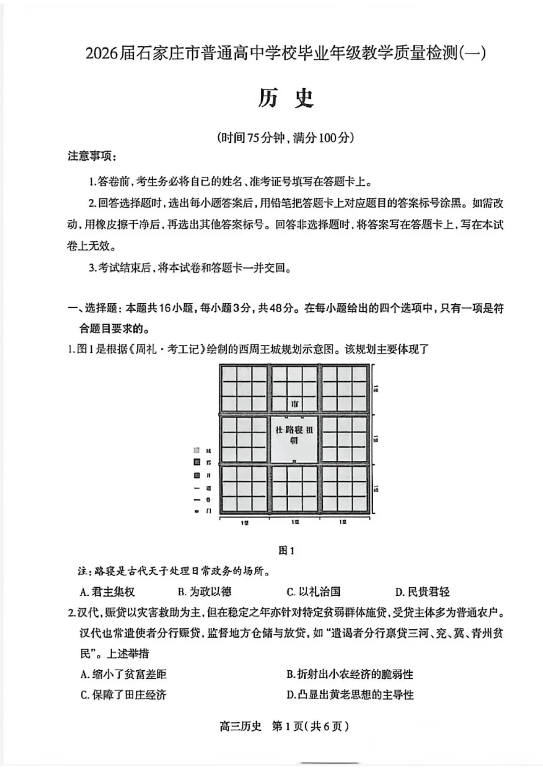 石家庄市2026届高三检测一历史试题及参考答案