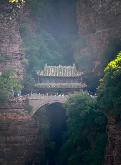 苍岩山的桥楼殿是整个景区的核心,很多人看到它都会惊讶,一座殿建在两座山峰之间的天然石桥上,这种建法在别的地方很少见,但你仔细看那个结构,会发现这不是为了奇特而奇特,是因为这个位置确实最合适。古人在这儿建庙,不是追求视觉效果,是因为这个地方风水好、采光好、通风好,所有的设计都是为了让人在这儿待得舒服、修行安心。