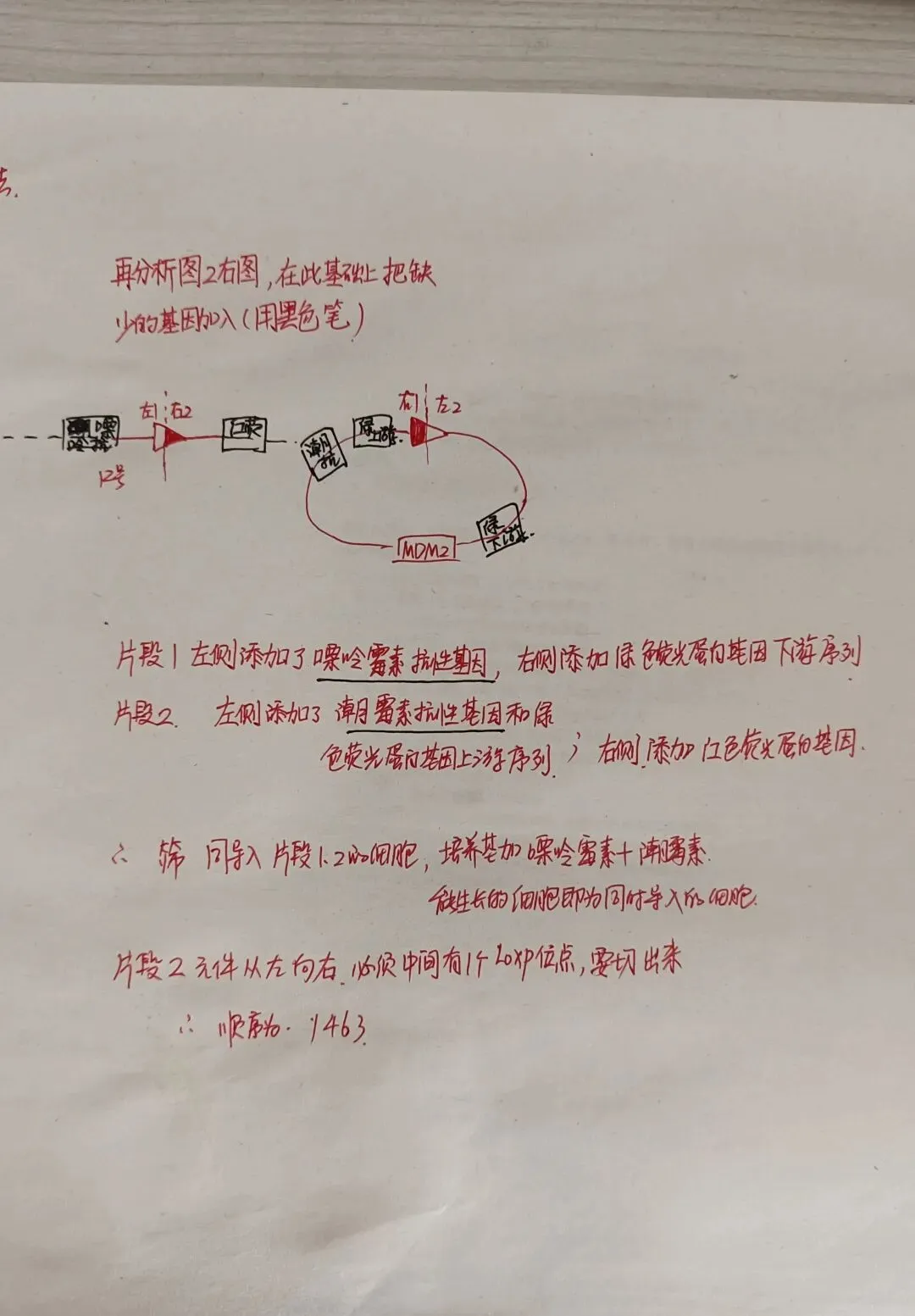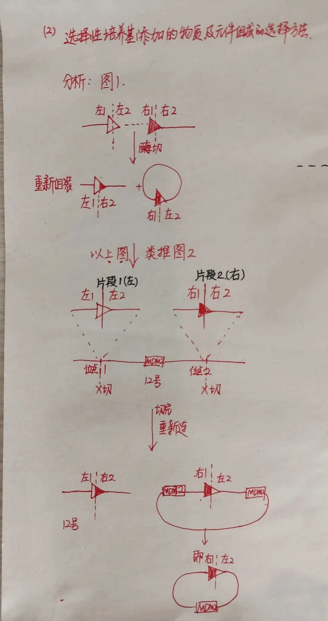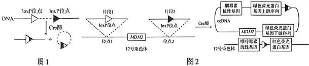 22.(12分)临床调查发现部分癌症患者的癌细胞中存在着携带原癌基因的ecDNA(由于染色体断裂和重新连接,形成游离于染色体外的环状DNA分子)。Cre酶可以将DNA上两个相同loxP位点之间的片段切割后环化,作用原理如图1所示。为构建与癌细胞中类似的ecDNA用于研究。研究者将片段1和片段2(两段均为含loxP位点和标记基因的外源DNA)插入小鼠细胞的12号染色体,再用Cre酶处理,构建了含原癌基因MDM2的ecDNA的细胞模型,过程如图2所示。