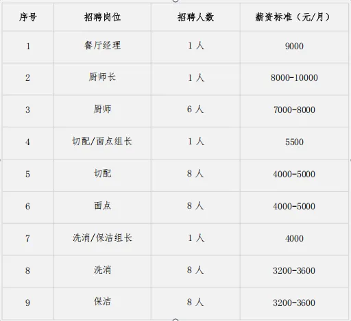 3.厨师:有 5 年以上厨师工作经验,熟练掌握各类家常菜、校园餐的烹饪技巧,能独立完成菜品制作,熟悉食材处理、火候把控,注重菜品口感和颜值,有厨师证优先,校园餐厅工作经验者优先。
