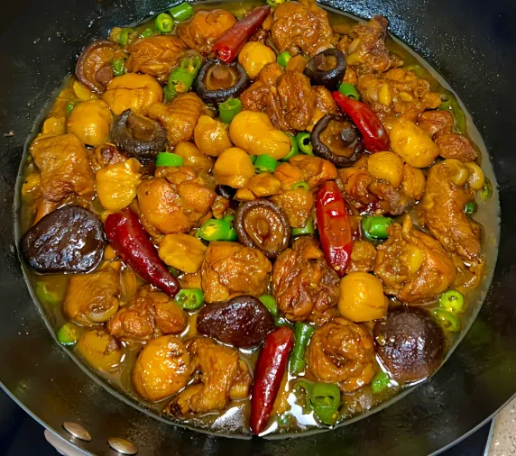 这里最有代表性的,还是板栗烧鸡。做法不复杂,先把鸡块煸出香气,再下葱姜、酱油和一点糖色慢炖,等汤滚开后放入去壳板栗,小火收汁。关键不是调料重,而是火候稳。栗子把鸡汤吃进去,鸡肉又沾了栗子的甜,吃起来就很北方,也很家常。