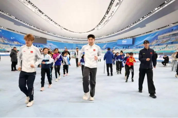 作为河北冰雪运动的优秀代表,李文淏在米兰冬奥会上奋勇拼搏,摘得铜牌,创造历史,为国家争得荣誉,也彰显了河北冰雪运动发展的坚实成果。活动现场,在速度滑冰国家队主教练李琰的指导下,李文淏与队友刘瀚彬、吴宇带领大众选手开展专业热身,还以“第一棒”身份领衔,与民间滑冰高手以团体赛队形共同畅滑“冰丝带”,让大众爱好者近距离感受专业运动员的技术风采,体验冬奥赛道的独特魅力。
