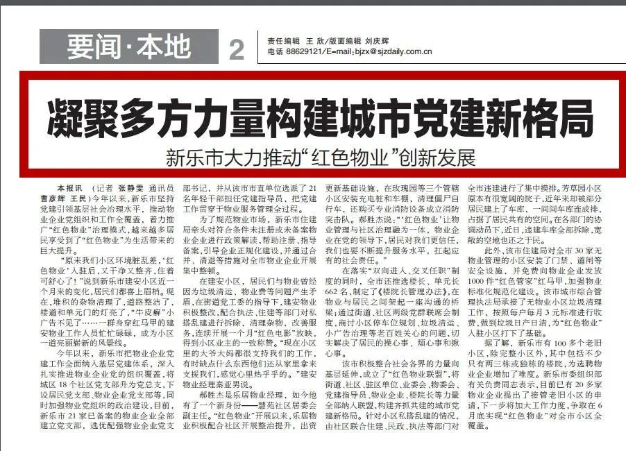 本报讯 (记者 张静雯 通讯员 曹彦辉 王民)今年以来,新乐市坚持党建引领基层社会治理水平,推动物业企业党组织和工作全覆盖,着力推广“红色物业”治理模式,越来越多居民享受到了“红色物业”为生活带来的巨大提升。