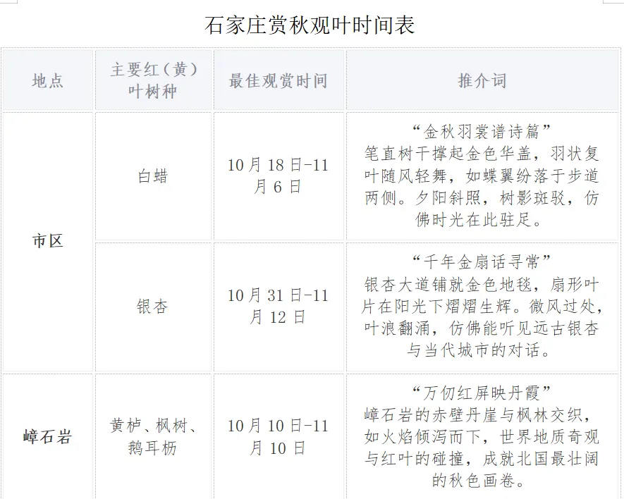 进入10月,冷空气势力增强,石家庄市气温持续下降,加速了红叶变色速度。据石家庄市气象局气候监测和物候观测资料分析,预计今年赏秋最佳观赏期为10月中旬至11月上旬。不同树种观赏时间各不相同,受局地小气候影响,不同地域的观赏时间也各不相同。