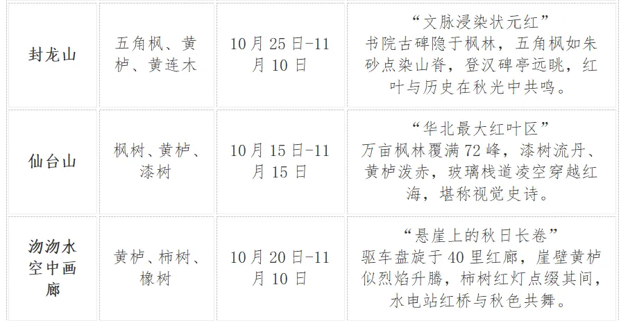 由于今年夏季气温偏高、日照充足,植被长势茂盛,叶片质量完整舒展,为秋色提供了良好基础。根据物候观测情况,西部山区高海拔区域如驼梁、五岳寨等地,预计树叶在10月上旬进入变色始期,而西部浅山区和平原区域则于10月中旬开始变色。