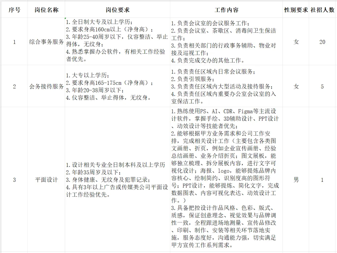 根据企业业务发展和工作需要,现委托河北诺亚人力资源发展集团有限公司(以下简称“河北诺亚”)面向社会公开招聘26名工作人员,招聘相关事项公告如下:招聘岗位需求及招聘条件