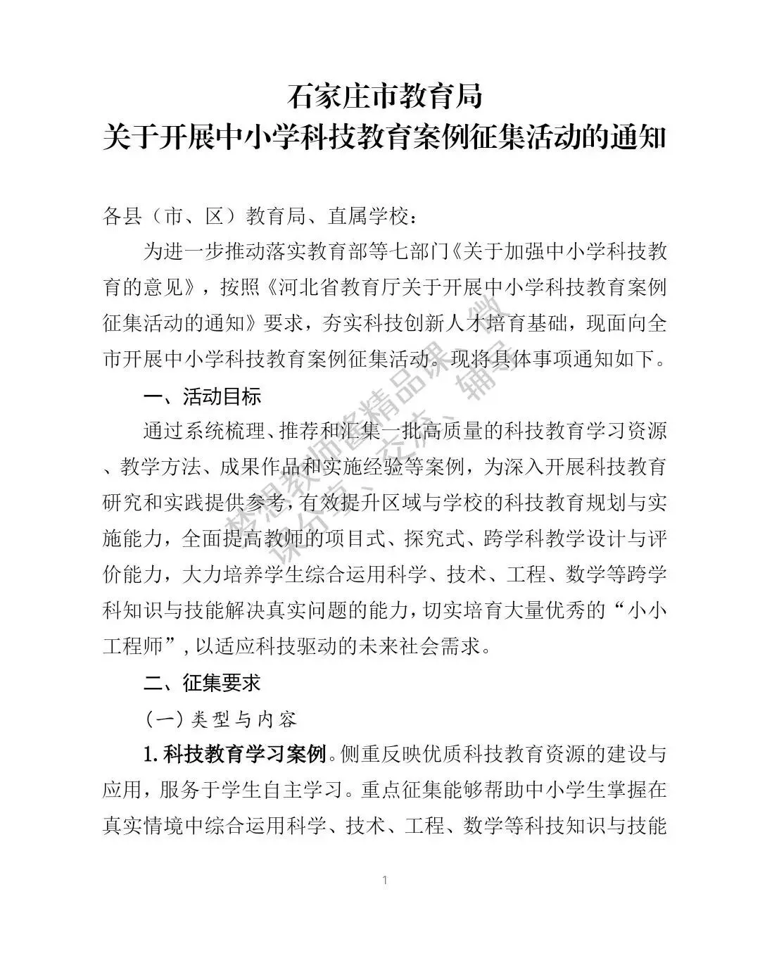石家庄市教育局关于开展中小学科技教育案例征集活动的通知