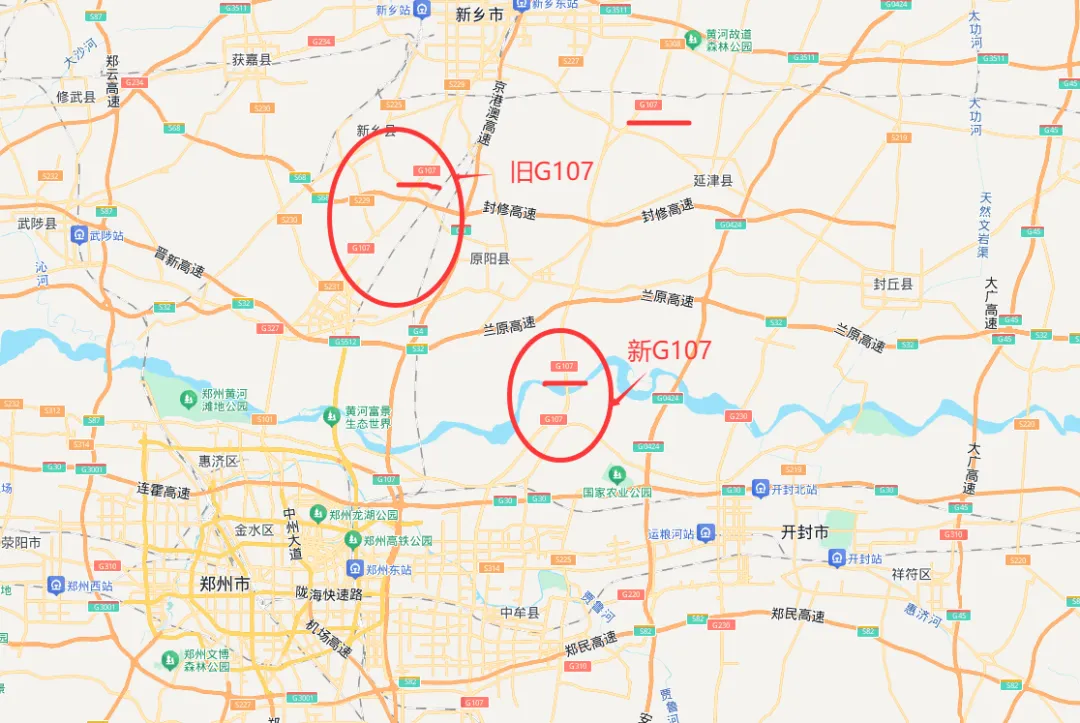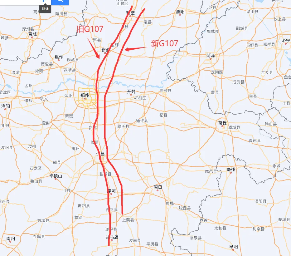 大家如果看下地图,在河南,有两条107国道,老线经过的都是主城区,新线位于城区的东侧。