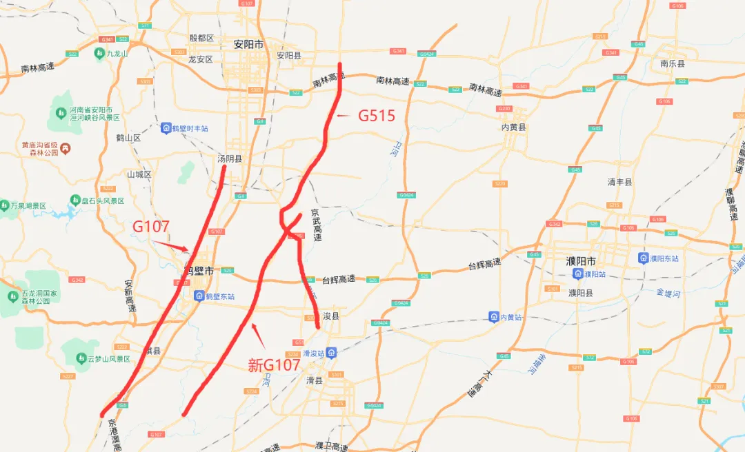 从地图上来看,河南新的107国道,北边到了浚县,也截止了浚县。而国道515也到了浚县。而且它们进行了交集。