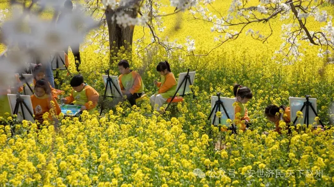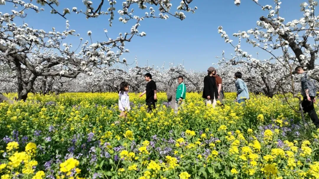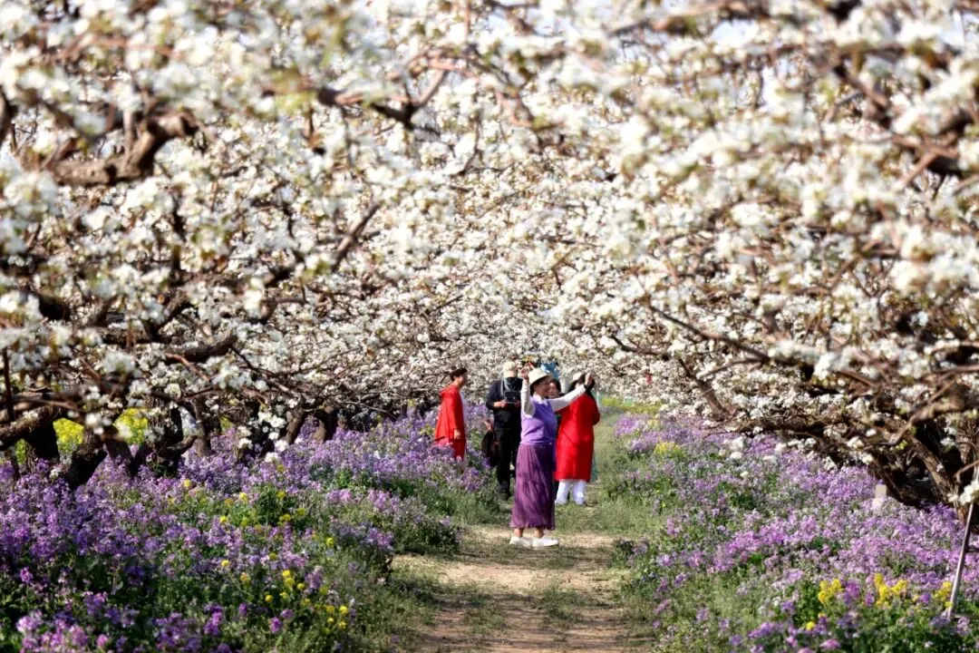 赵县,古称赵州,是“中国雪花梨之乡”。据史志记载,已有2000多年的栽培历史。从秦汉时代即开始种植,南北朝时成为“宫廷贡品”。北魏时,魏文帝诏令为“宫廷御梨”。 赵县梨园现有面积25万亩,古梨树群70个,入选中国重要农业文化遗产。这些历经风霜的古树不仅是“中国雪花梨之乡”的活化石,也构成了华北平原独特的农业文化遗产景观。清明前后的周家庄农业特色观光园,正迎来全年最美模样——梨园琼枝叠雪,油菜花铺展成金,榆叶梅、桃花、二月兰次第绽放,七彩花田交织成春日最动人的画卷。