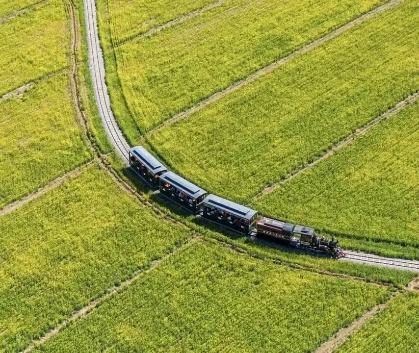 坐上观光小火车,穿越花海长廊!金黄油菜、粉艳桃花轮番映入眼帘,风拂过花瓣簌簌飘落,像下了一场温柔的花雨,治愈感拉满。