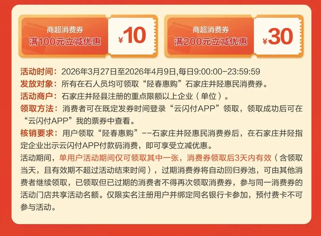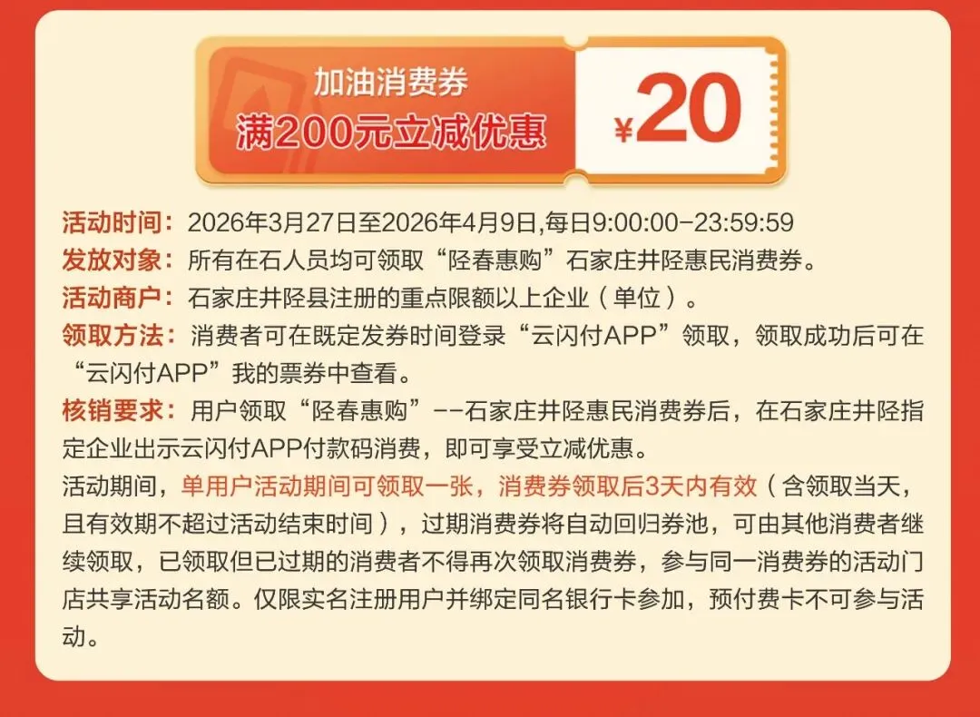 用户领取“陉春惠购”--石家庄井陉惠民消费券后,在石家庄井陉指定企业出示云闪付APP付款码消费,即可享受立减优惠。