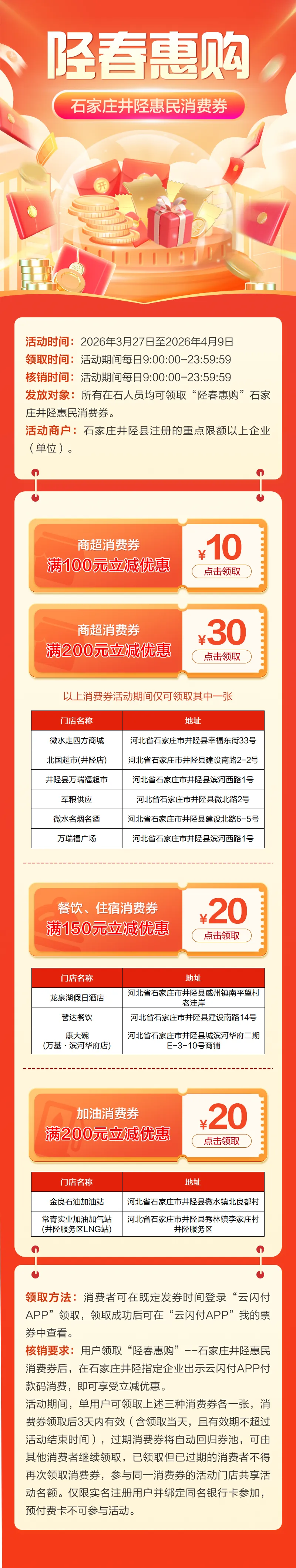 参与商户:微水走四方商城、北国超市(井陉店)、井陉县万瑞福超市、军粮供应、微水名烟名酒、万瑞福广场