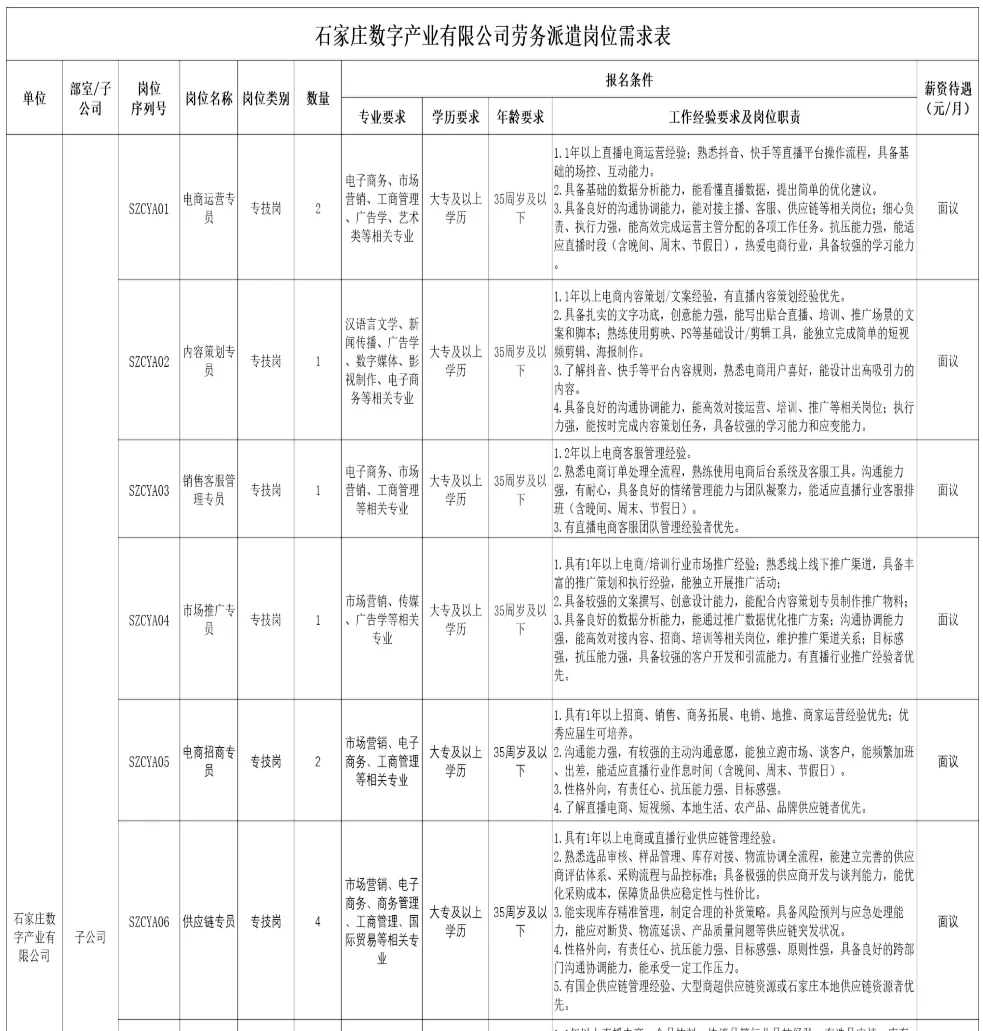 根据工作需要,石家庄数字产业有限公司特委托石家庄市国经人力资源管理有限公司面向社会公开招聘劳务派遣制人员18名。现将具体招聘流程设定如下: