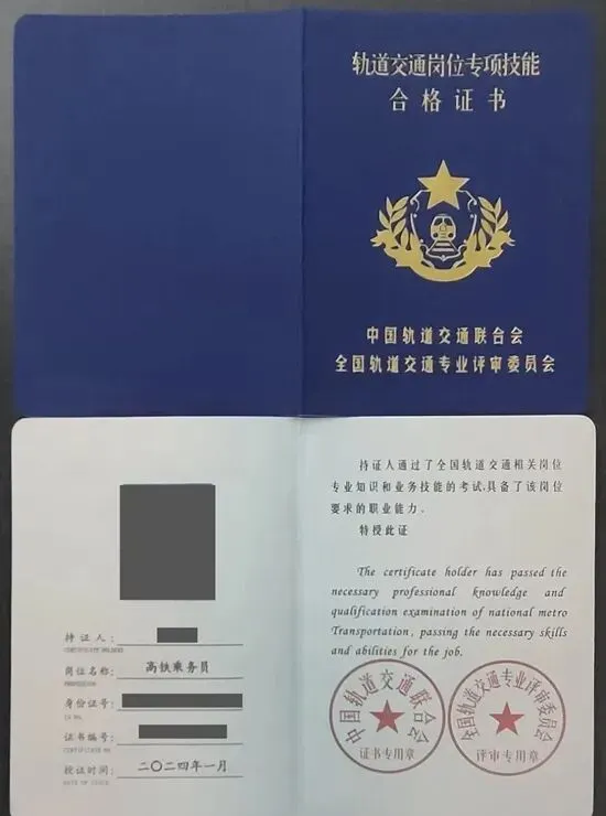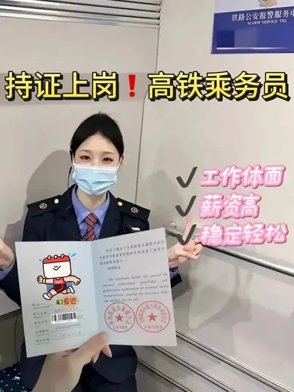 针对在列车上从事旅客服务的乘务人员,考核内容包括列车服务规范、旅客沟通技巧、应急处理流程等。这是成为高铁/动车乘务员的核心证书之一。
