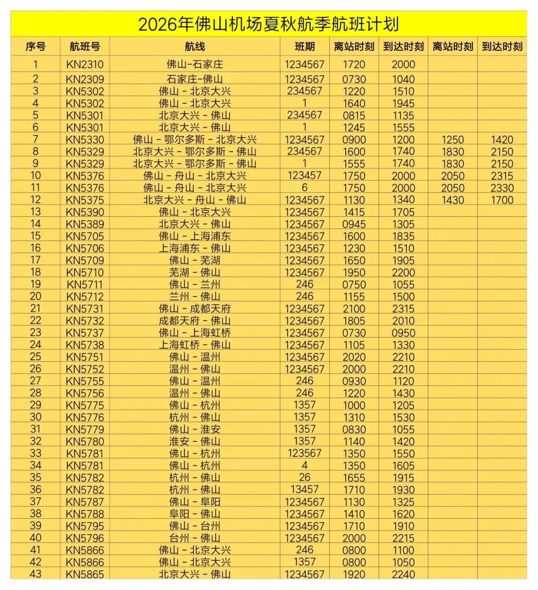2026 年 3 月 29 日至 10 月 24 日,佛山机场正式执行夏秋航季航班计划,共计 210 天。