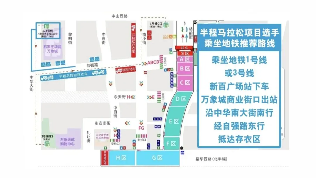 马拉松项目选手,建议乘坐地铁1号线到解放广场站下车,从B口或C口出站,沿中山西路西行,经南小街南行抵达存衣区。半程马拉松项目选手,建议乘坐地铁1号线或3号线到新百广场站下车,从万象城商业街口出站,沿中华南大街南行,经自强路东行抵达存衣区。初审:王兴悦、包晓玥
